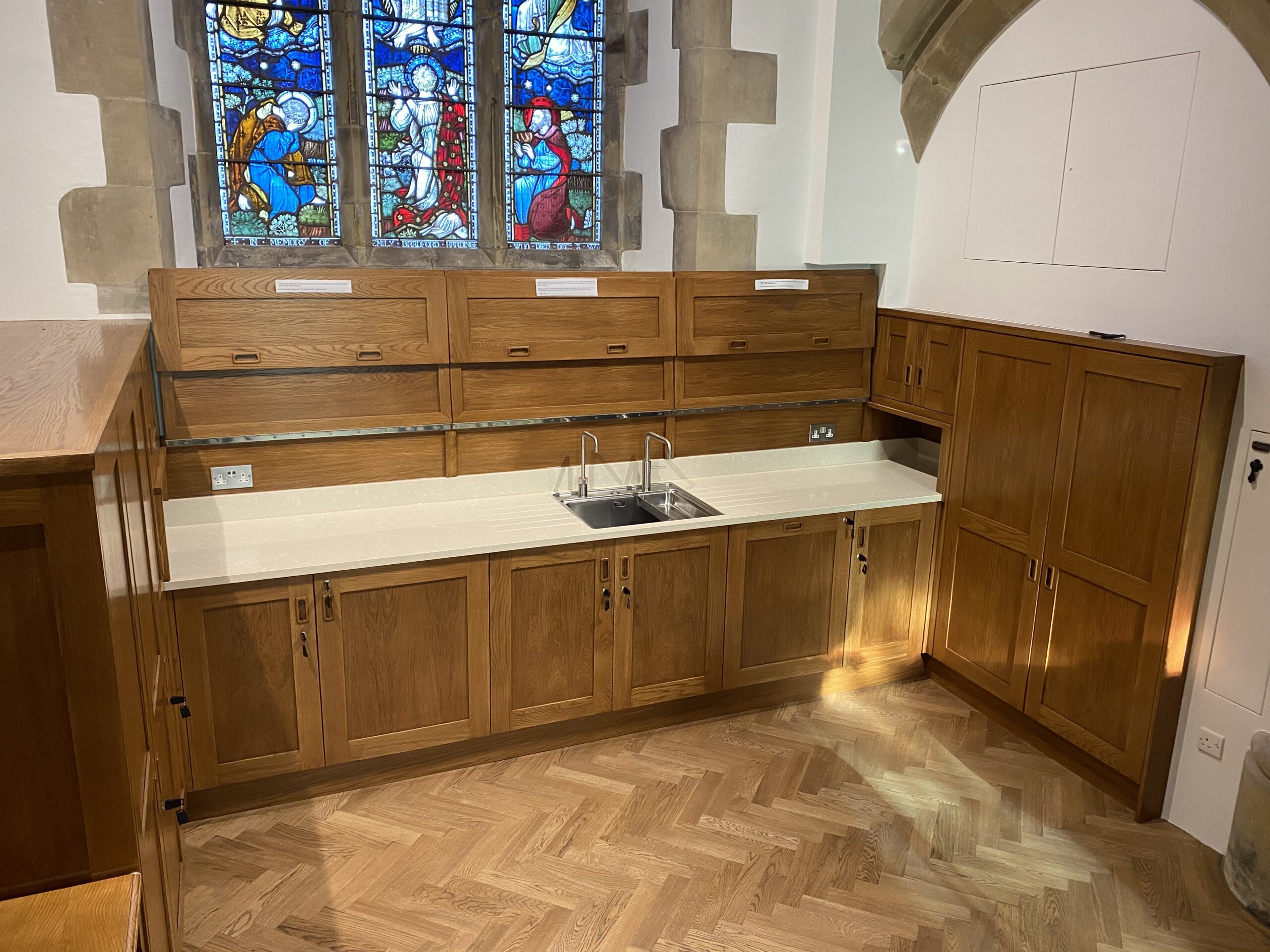 We also undertook internal alterations to the existing Church including supply and installation of a bespoke handmade kitchen, full internal redecoration, and heating and electrical overhaul providing this historic building with modern world facilities. The materials we used for this project were all carefully selected to aid sympathetic blending of new and old.